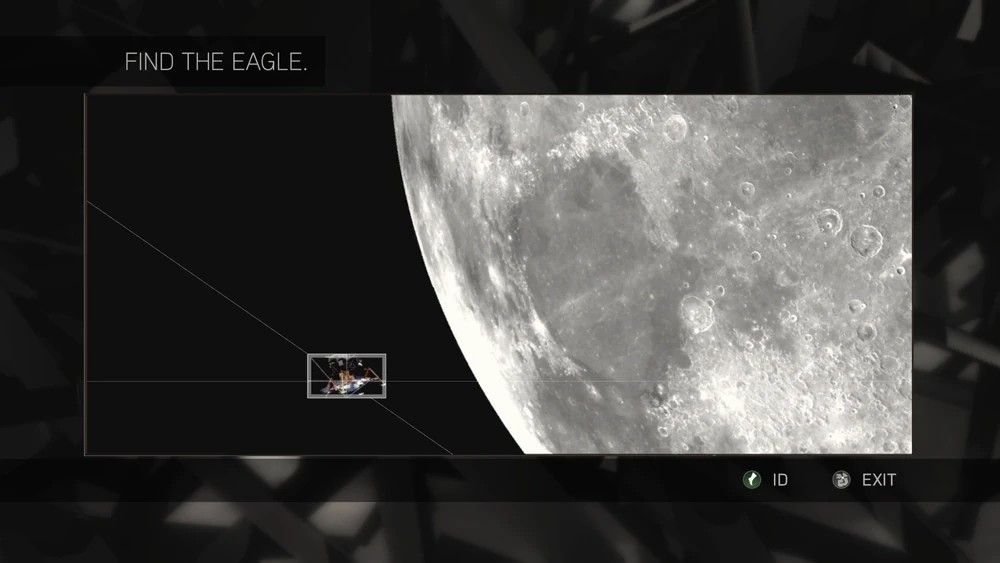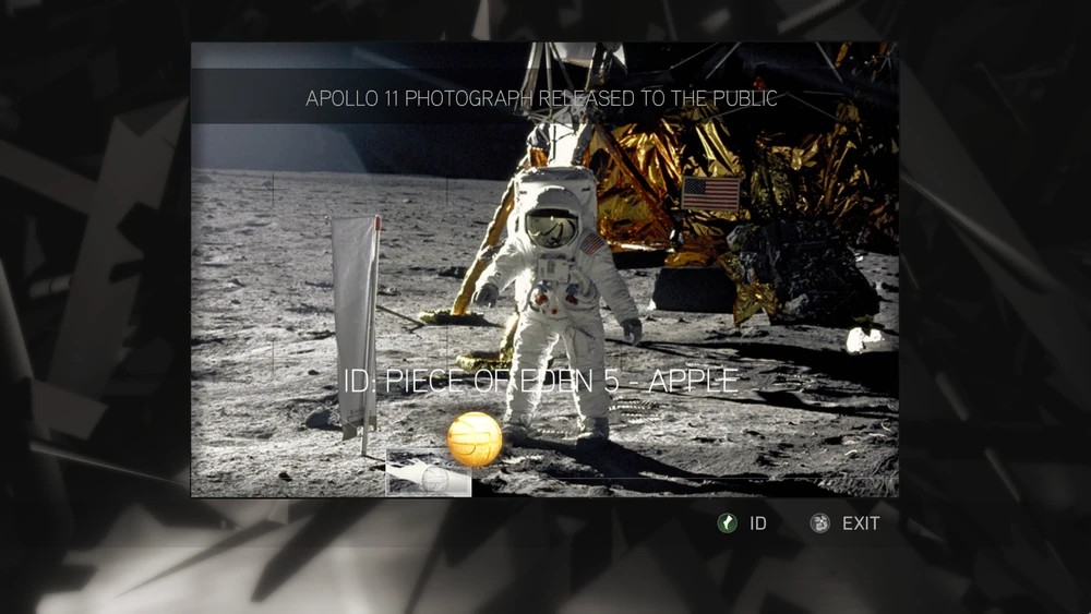 The third and final phase of this puzzle shows a photograph from the Apollo 11 mission released to the public. Move the cursor following the sound and you’ll find the piece of Eden at the left foot of the astronaut.