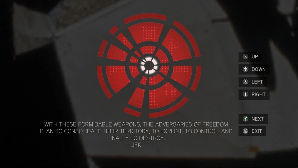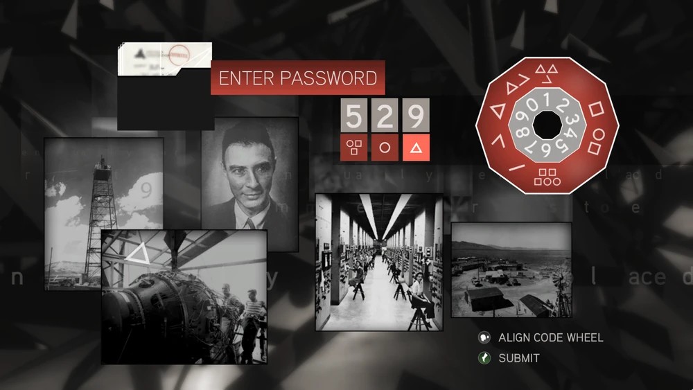 For the next phase, press the red button and after the recording of the atomic bomb test, move the cursor to find the code on the bottom of the image.