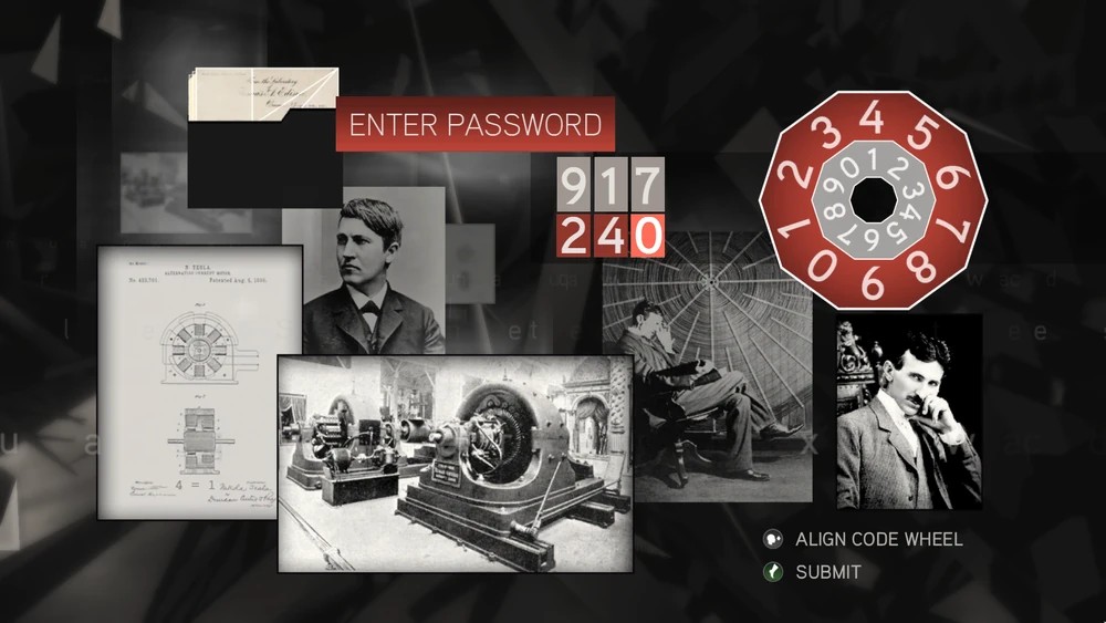 Following Nichola Tesla, the next puzzle will need a password to be solved. You see a selection of photos and two wheels of numbers to get the password. In the sketch in the left corner you’ll find the code:
