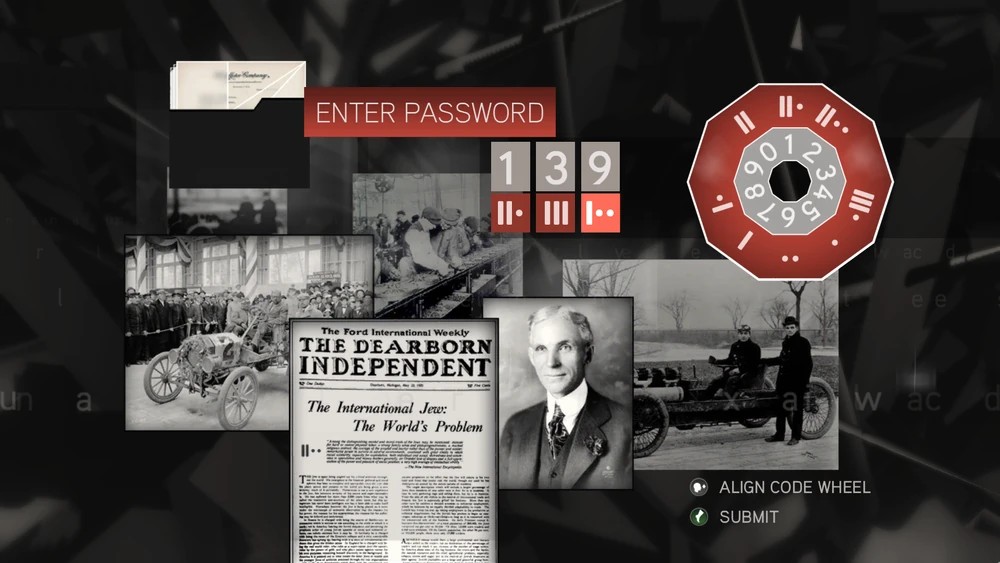 For the third phase there is another wheel puzzle to get a password. Look at the photos, you’ll find the number 2 on the racing cards and ||·· on the newspaper picture.