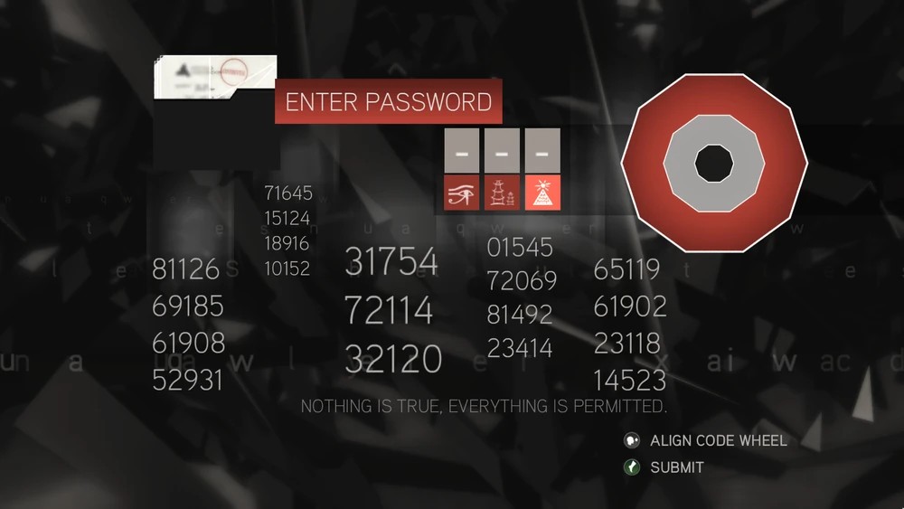 For the second phase follow the Assassin’s motto “Nothing is true, everything is permitted” as shown in the bottom part of the screen. This means you can enter any code, as it has no right or wrong answer.