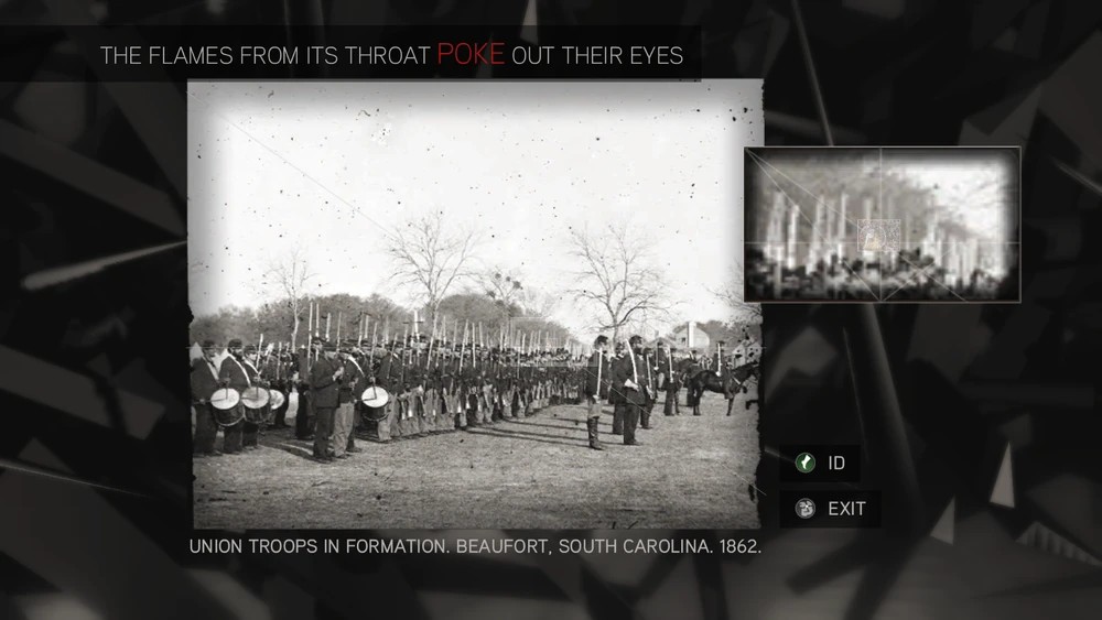 - Third image: “THE FLAMES FROM ITS THROAT POKE OUT THEIR EYES” Zoom in on the first line of soldiers, to the weapons.