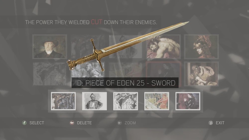 - First image: “THE POWER THEY WELDED CUT DOWN THEIR ENEMIES”. Select all 5 images with swords in them to unlock the Piece of Eden 25.