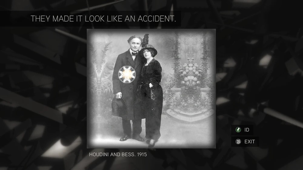 The first image reads “THEY MADE IT LOOK LIKE AN ACCIDENT”, and shows Houdini and Bess in 1915. The Piece of Eden is inside Houdini’s coat.