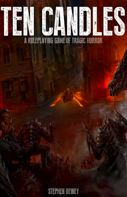 Ten candles narrates the story of the few survivors in the midst of a sunless apocalypse. Players take the roles of these survivors living the last few hours of their character lives. The game master controls the unseen adversaries who stalk the players and wait just beyond the light’s edge. Ten candles tells the story of what happens in the dark. What happens to those who fight it and their inevitable end.