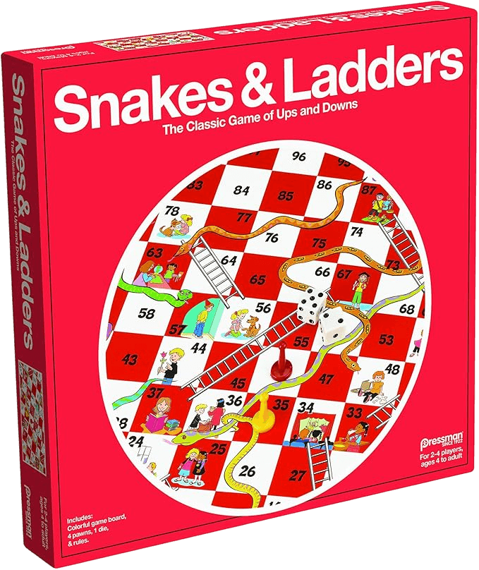Snakes and Ladders is a clear example of a pure luck-based board game. Player movement is determined  entirely by rolling a die, and players have no control over the outcome of their turn. Landing on a ladder can rapidly advance a player’s position, while landing on a snake can significantly set them back.