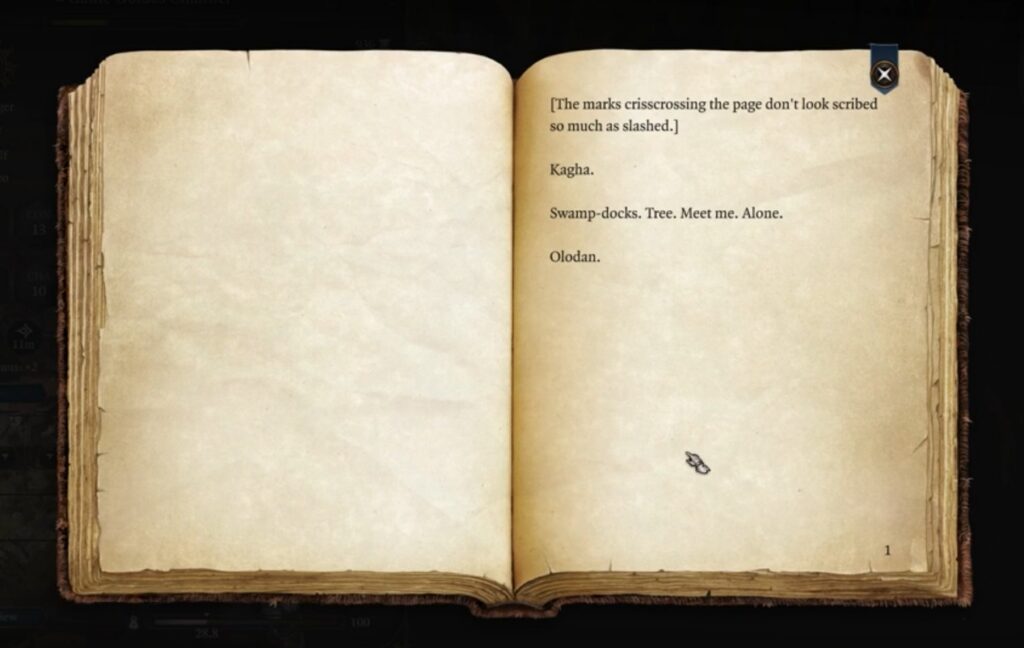 In the chest, you will find a letter addressed to Kagha from a certain Olodan, who asks her to go alone to Swamp-docks.